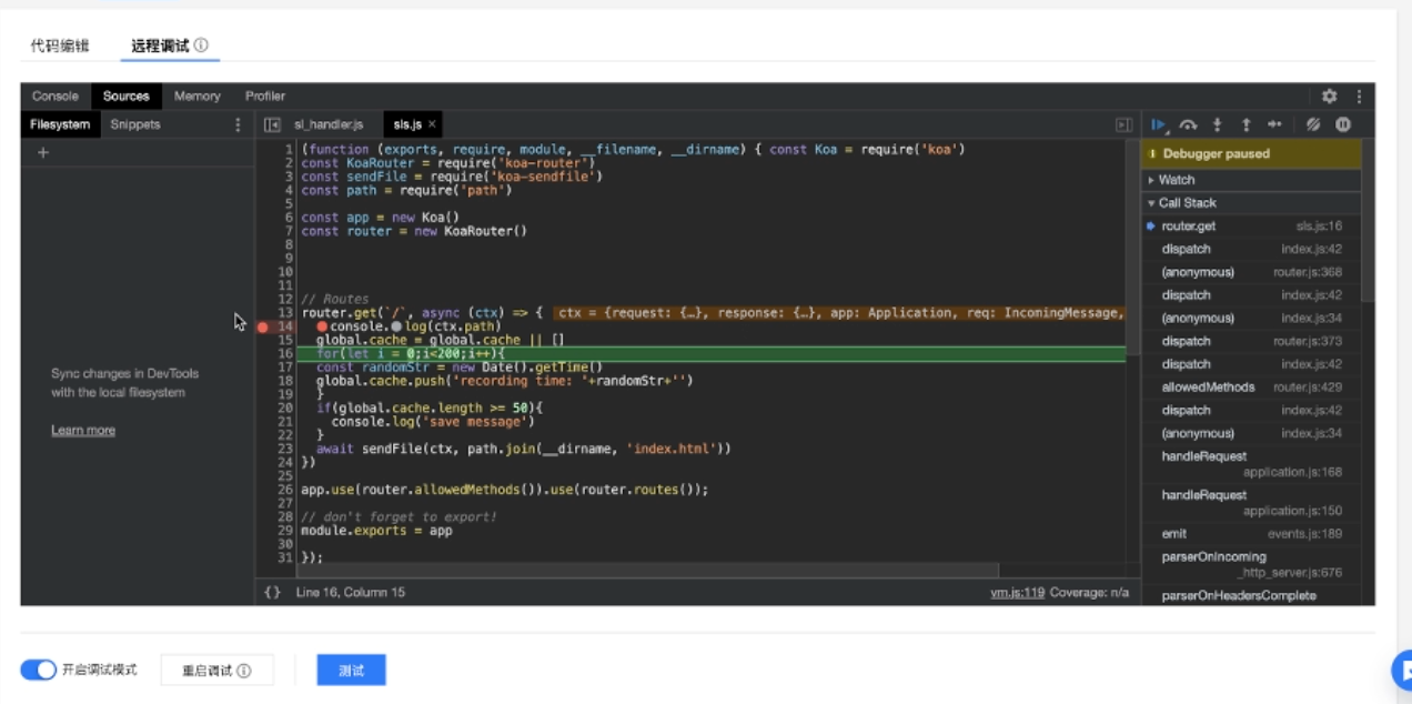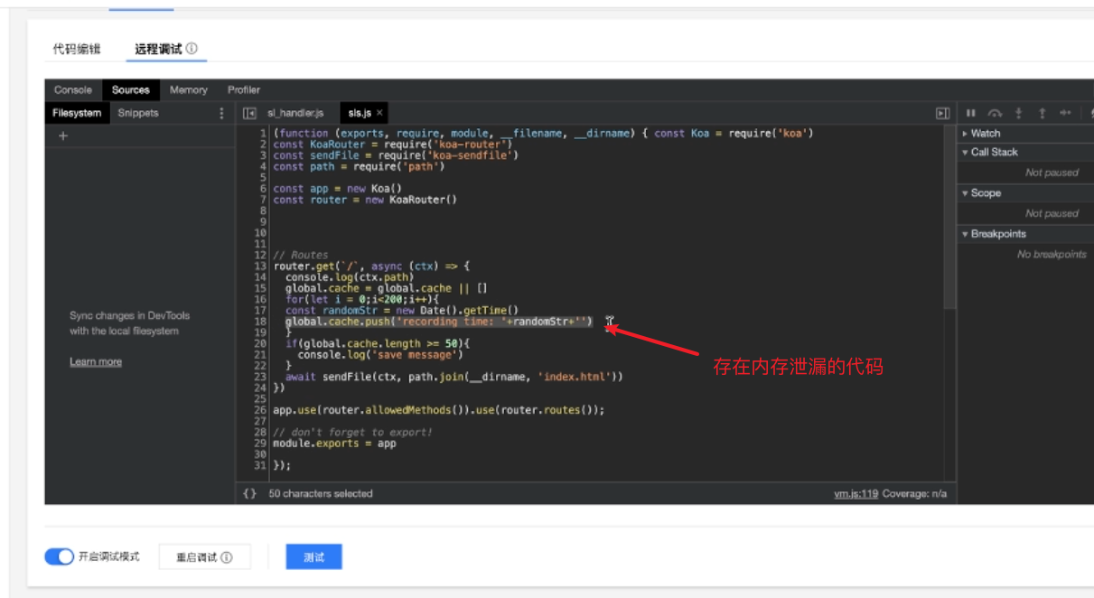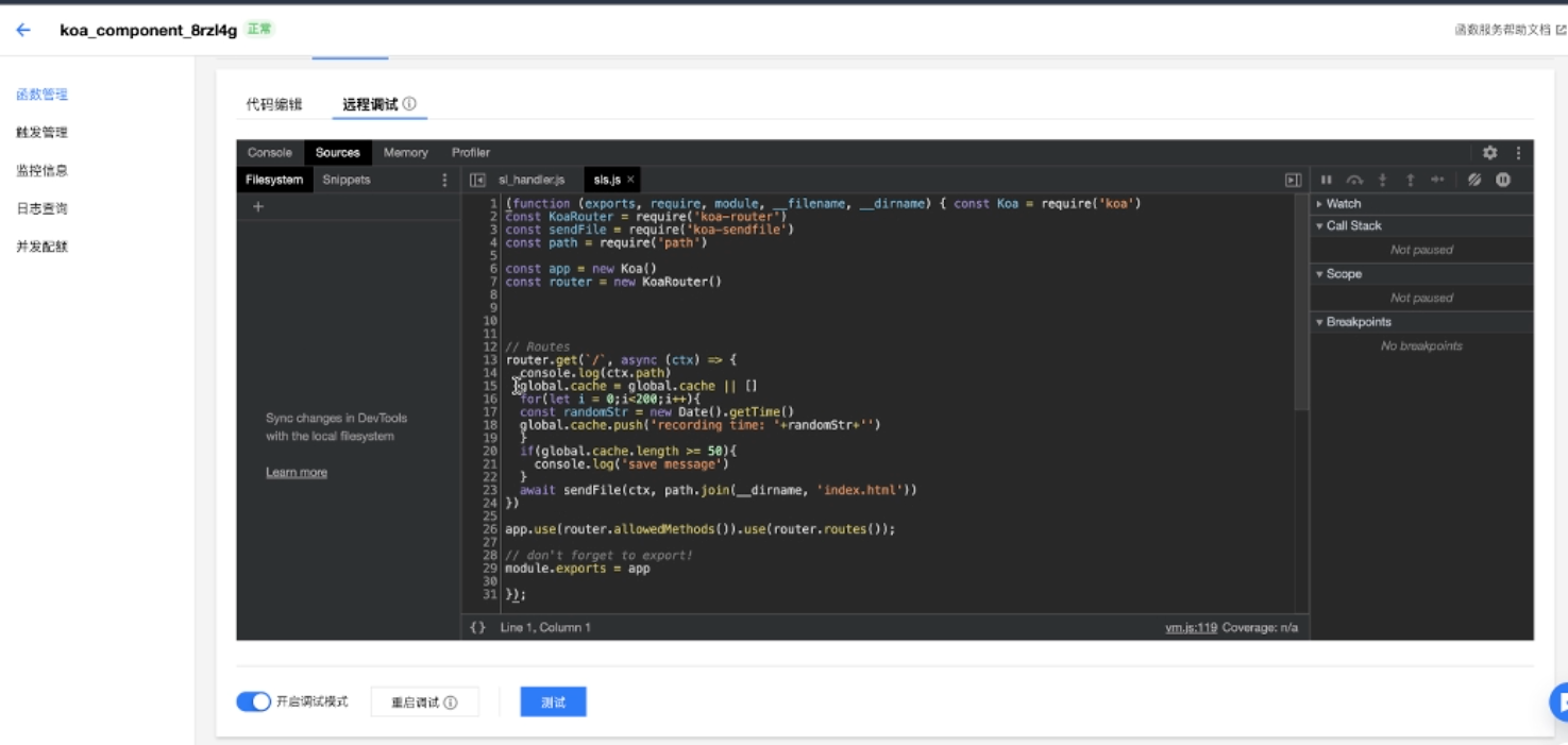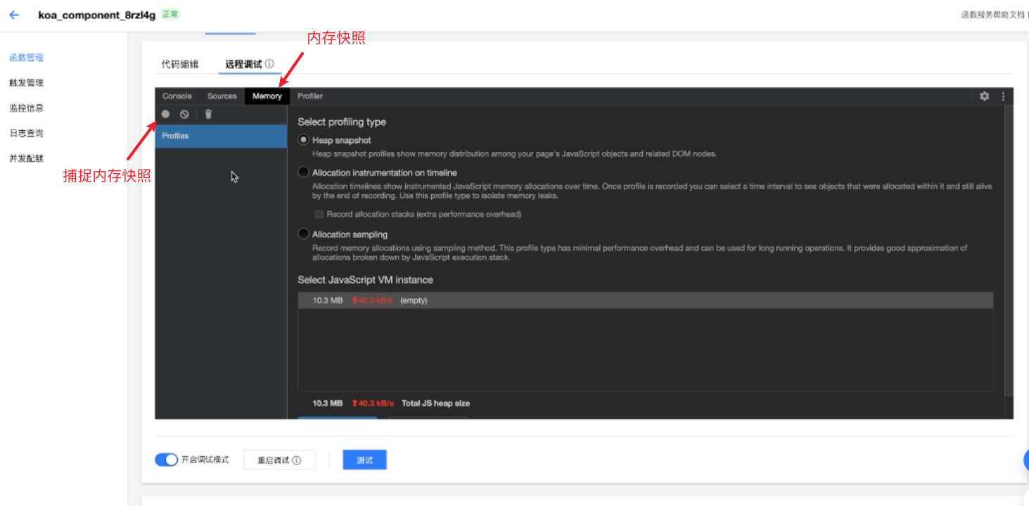 本篇文章将以一段内存泄漏的代码为例,给大家展示如何使用云函数在线调试功能定位和解决问题。Node10 及以上版本的 runtime,使用 Chrome 浏览器打开云函数控制台,在函数代码页即可看到在线调试的入口。