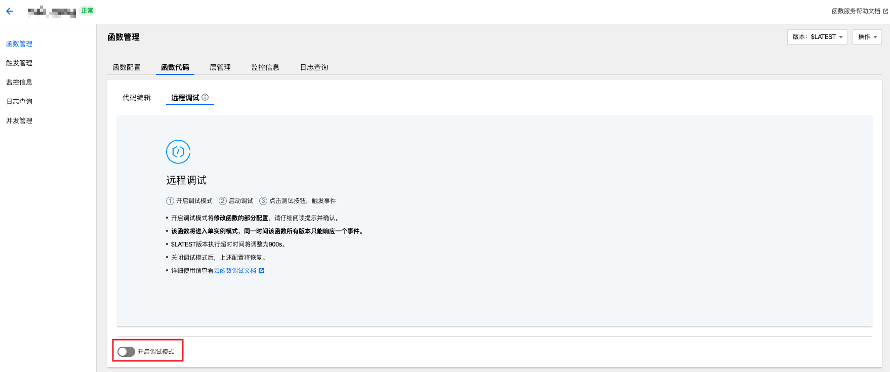 使用Chrome浏览器打开函数代码编辑页,可以看到在【远程调试】页。为保障调试的体验,开启调试模式将修改函数的部分配置,包括函数进入单实例模式、函数超时时间修改为900秒等。开启前请务必确认这些调整。