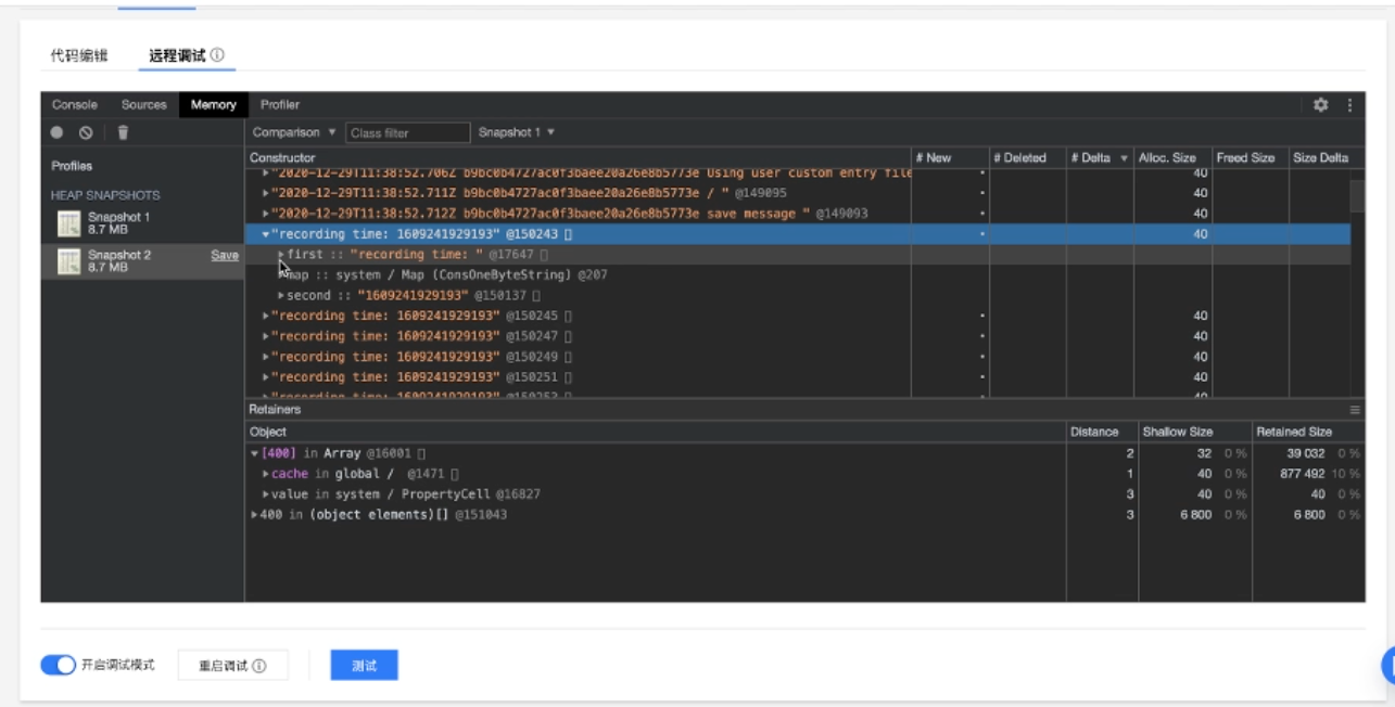 这部分介绍如何使用内存快照功能排查内存泄漏的问题。内存泄漏的排查方法大致为:找准内存泄漏的时机,在泄漏的前后对内存进行快照,通过对比快照的内容判断内存泄漏的问题点。