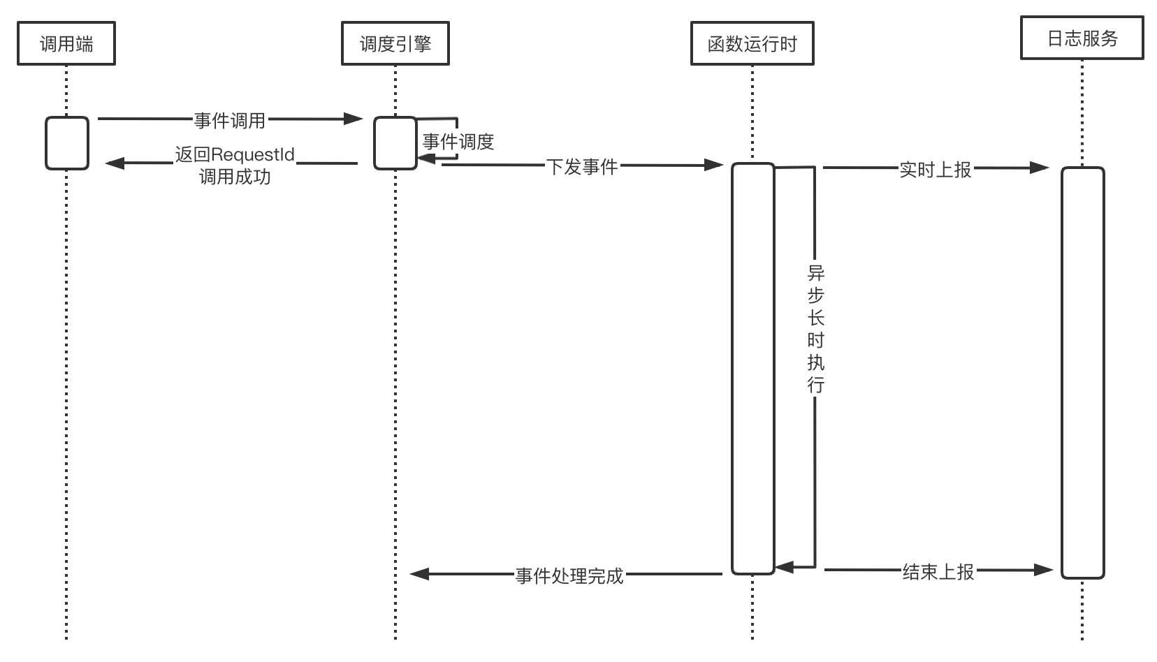 函数启用异步执行后,通过同步(例如 API 网关)或异步(例如 COS、CKafka、Timer 等)调用端进行事件调用,函数将以异步执行模式响应事件。 即完成事件调度后立即返回事件的调用标识 RequestId,并结束调用操作,调用端无需阻塞等待。返回 RequestId 的同时,调用引擎将并行下发事件到函数运行时,开启函数逻辑执行。进入异步执行状态后,执行日志将实时上报至日志服务,提供对异步执行事件运行情况的实时反馈。其原理如图所示: