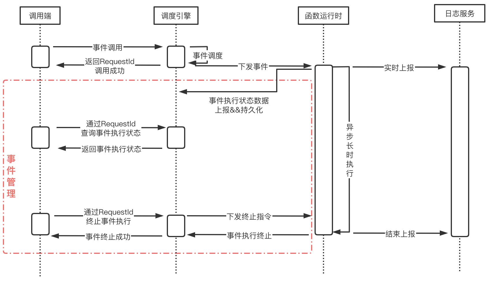 函数高级配置启用状态追踪后,针对异步执行的事件,将开始记录并上报事件响应的实时状态,并提供事件状态的统计、查询及终止等事件管理相关服务。其原理如下图所示: