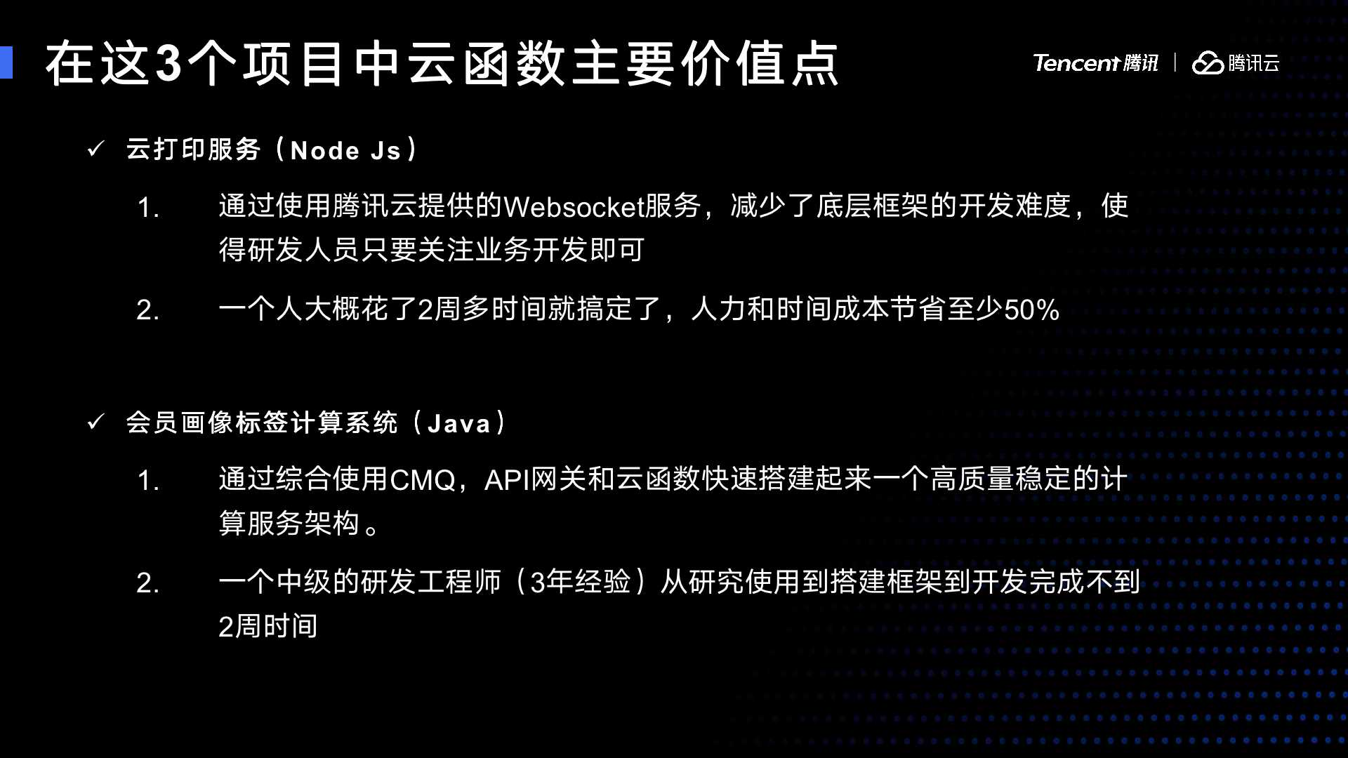 刚才提到的CMQ、COS、LB负载均衡用起来,你会发现极大的降低其他综合流程,整个研发效率都会有比较大的提升。包括我们系统稳定性,基本上扩容这个事情,绝大部分都不需要考虑。一般我们在建系统的时候,你要考虑的是你的各个系统,你的峰值。80%的时间,你的CPU只有10%或者是1%。这样的情况下,云函数参数会有比较大的优点在你峰值低的时候,会降到很低的成本。你的费用是按照运行次数和时间和运行内存来综合计算的。