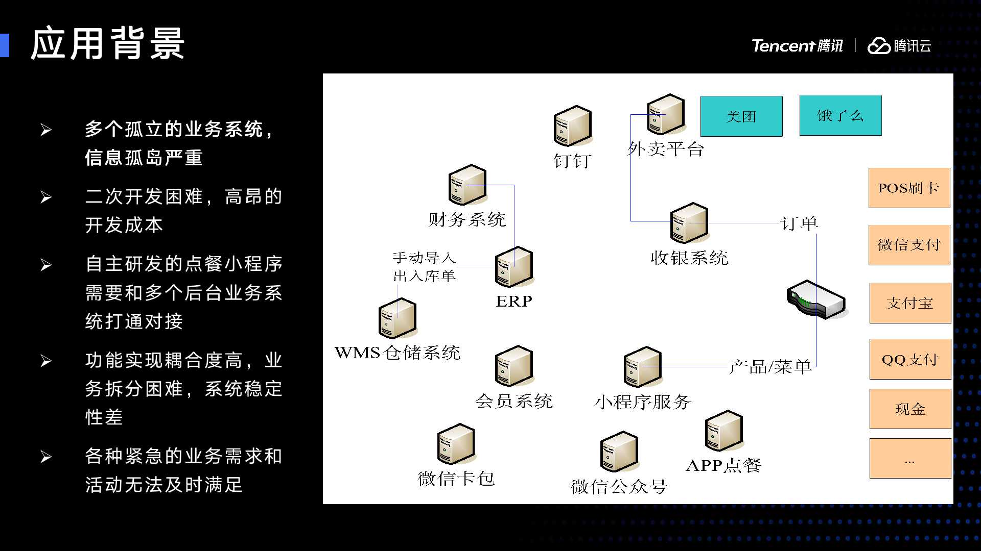 17年底,我们做了我们自己的小程序点餐系统,这个系统本身需要和后台业务系统打通,这个时候需要解决多个系统之间的互联互通问题。另外就是业务系统耦合度高,业务拆分困难,系统稳定性差,各种紧急的业务需求和活动无法及时满足。所以我们尝试先通过 Serverless 做一些局部的改造。