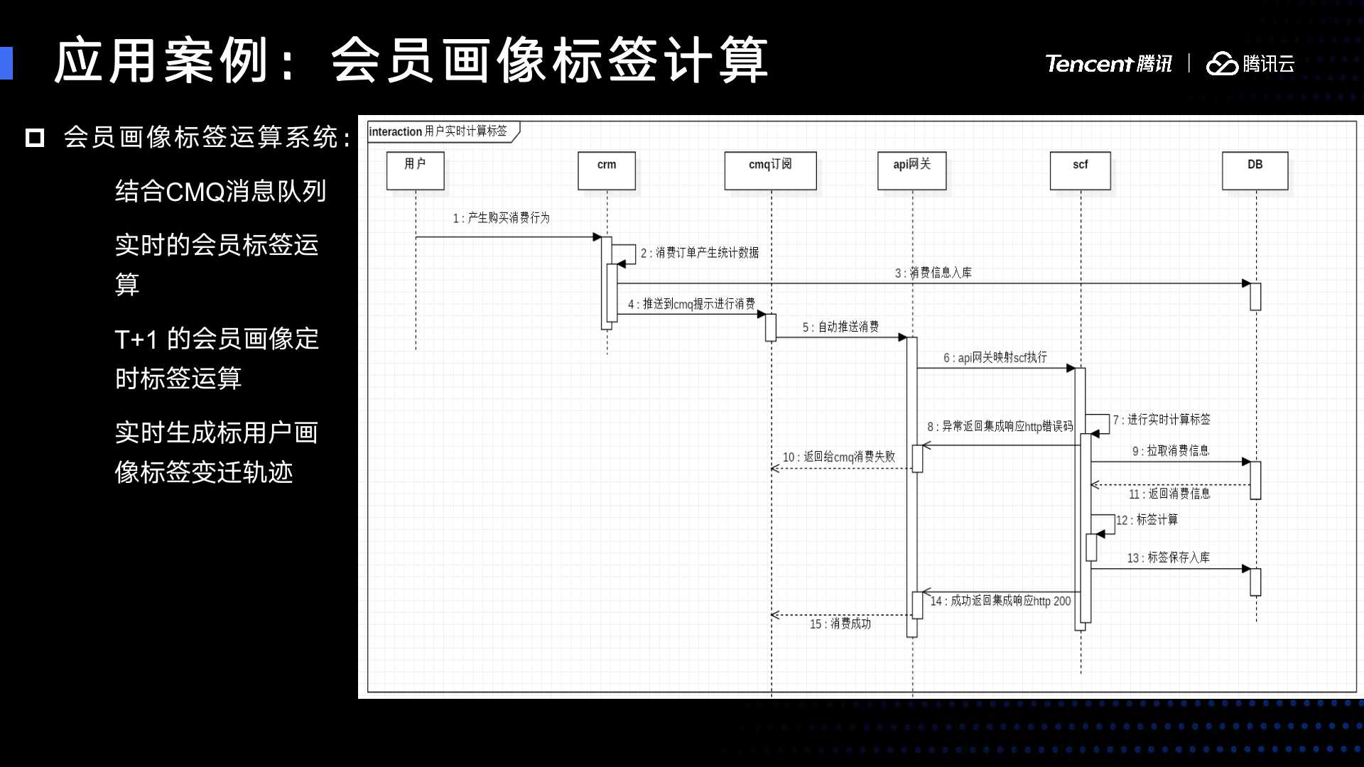 Serverless 云函数,每一个云函数会对应一类标签,包括消费频次,消费偏好等等标签,这类云函数对它进行标签的实时运算,如果计算过程中产生错误,会把这个消息反馈给CMQ,CMQ告诉消费失败,如果正常的话,会拉取数据,拉取完之后标签计算,标签计算完成之后,我们会把标签保存入库,最终生成用户画像,最终消费成功,整个标签计算完成,整个消费完成。通过这样的方式,我们完成了整个会员画像实时计算系统。