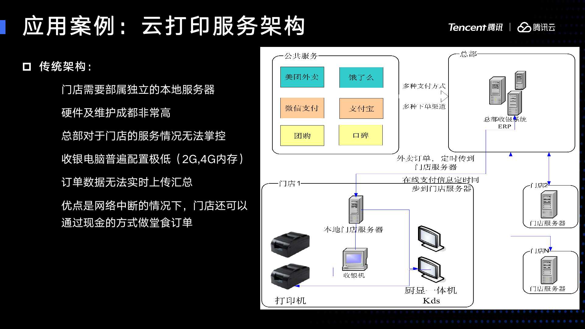 在传统的架构里,每一个门店都会有一个本地的服务器,这个本地的服务器会提供一个本地服务,我们门店需要有一个交银机,一个一体机,还有打印机,通过本地服务器进行管控。总部也需要有服务,总部进行数据的整合,例如:美团的订单,会先把订单下到总部的服务器上,总部服务器把这个数据推送到门店,门店服务器接到数据之后,它才能够通知到打印机进行打印小票,由此来完成整个门店业务的管理。