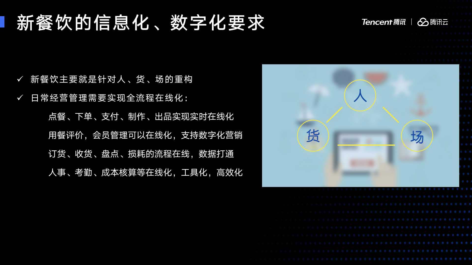 首先讲一下我们对新餐饮的思考,它在信息化数字化的要求,新餐饮本身也是人货场的重构,主要实现我们日常经营管理所有的数据能够全流程在线化,主要分为四块: