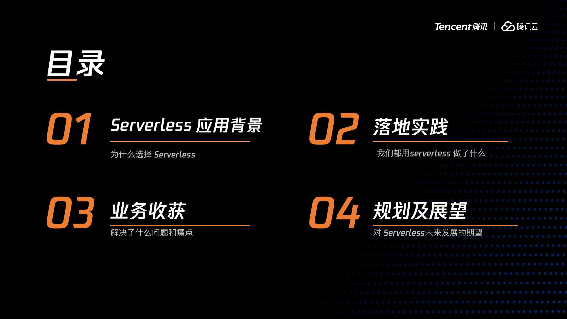 今天分享四部分,第一部分讲一下 Serverless 的应用背景。第二部分是关于我们用 Serverless 做了什么,第三部分我会分享下 Serverless 解决了业务上哪些痛点,第四部分讲一下未来在Serverless 应用上的发展规划,以及Serverless 使用过程中有哪些挑战和注意事项。