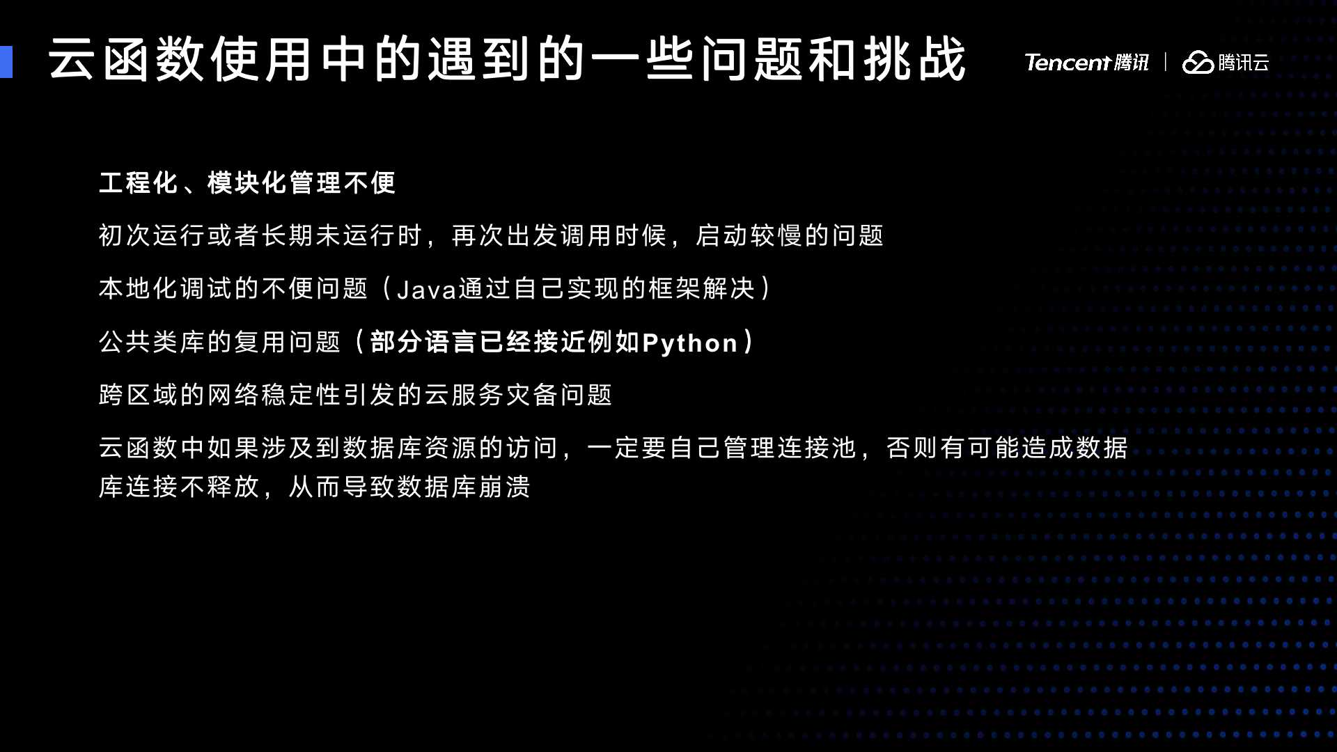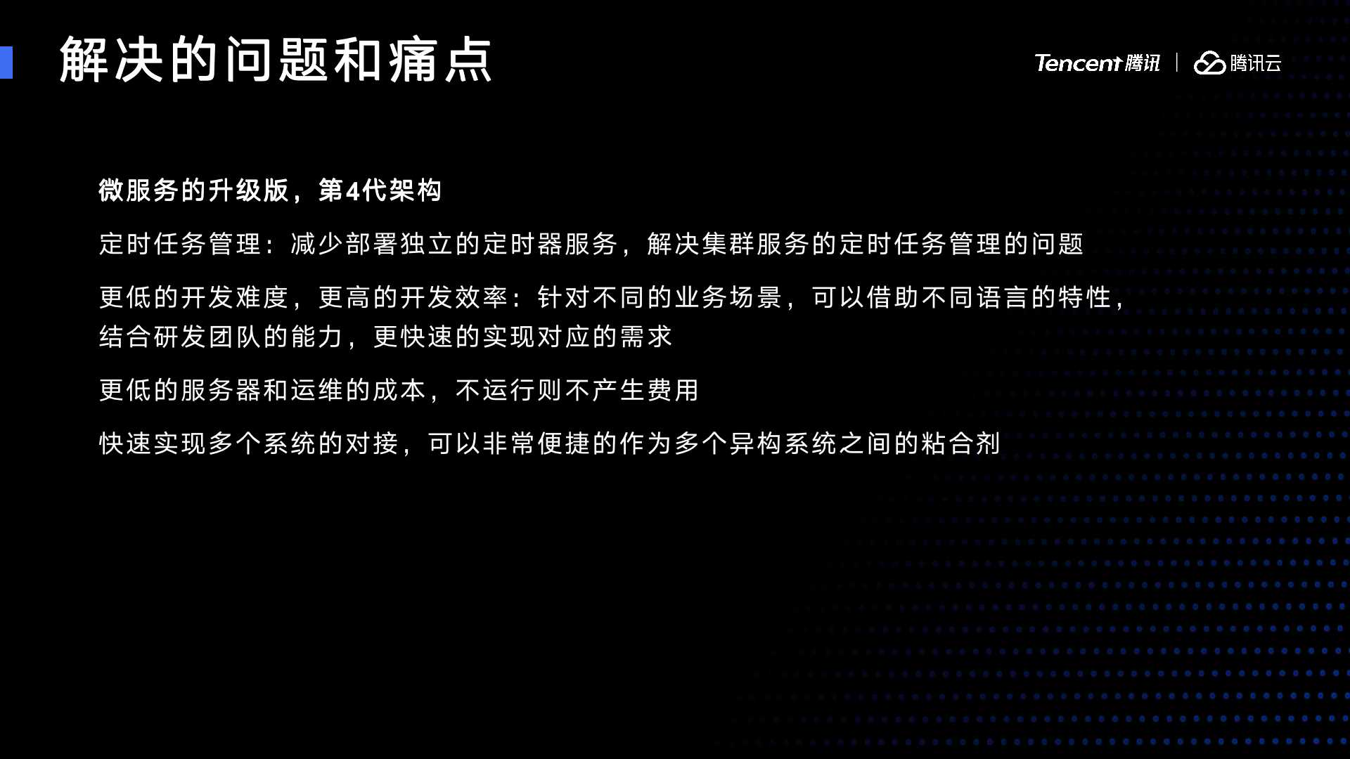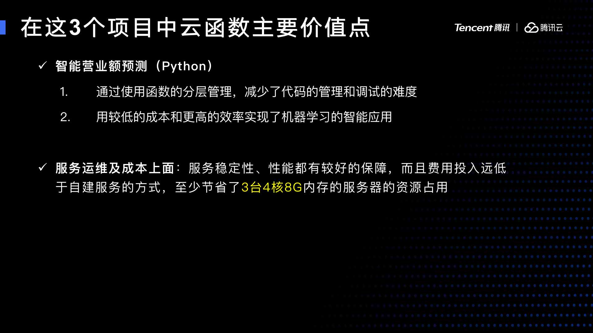 最后,运维成本。因为云函数有一个很强的特征,不运行则不产生费用。第二个不产生资源的占比,没有多大服务器的成本。另外扩容也是全自动的。它的运维成本很低。