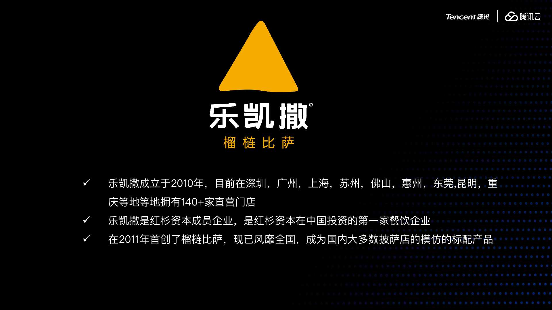 整理编辑:王天云 李永程乐凯撒是一个披萨的餐饮门店,目前在深圳、广州、上海、苏州、佛山、惠州、东莞、昆明、重庆等地拥有140多家直营门店。乐凯撒是红山资本成员企业,是红杉资本在中国投资的第一家餐饮企业。11年首创了榴莲比萨,现已风靡全国。
