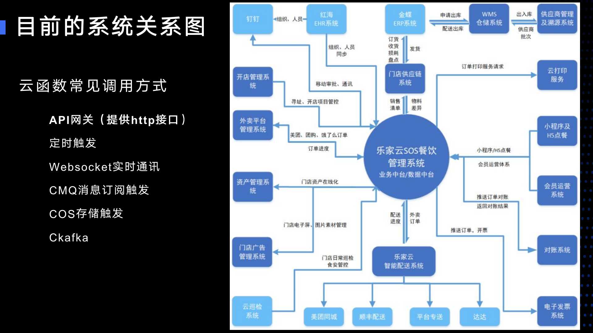 下图是我们以前建成的系统的架构图,我们现在的系统就是在这个基础上进行完善的。中间是业务中台,对接很多第三方系统,小系统包括我们云打印系统、点餐系统、会员系统、配送系统、开店管理系统,还有第三方系统,比如说金蝶ERP系统、红海EHR系统,第三方系统又会产生数据交互。