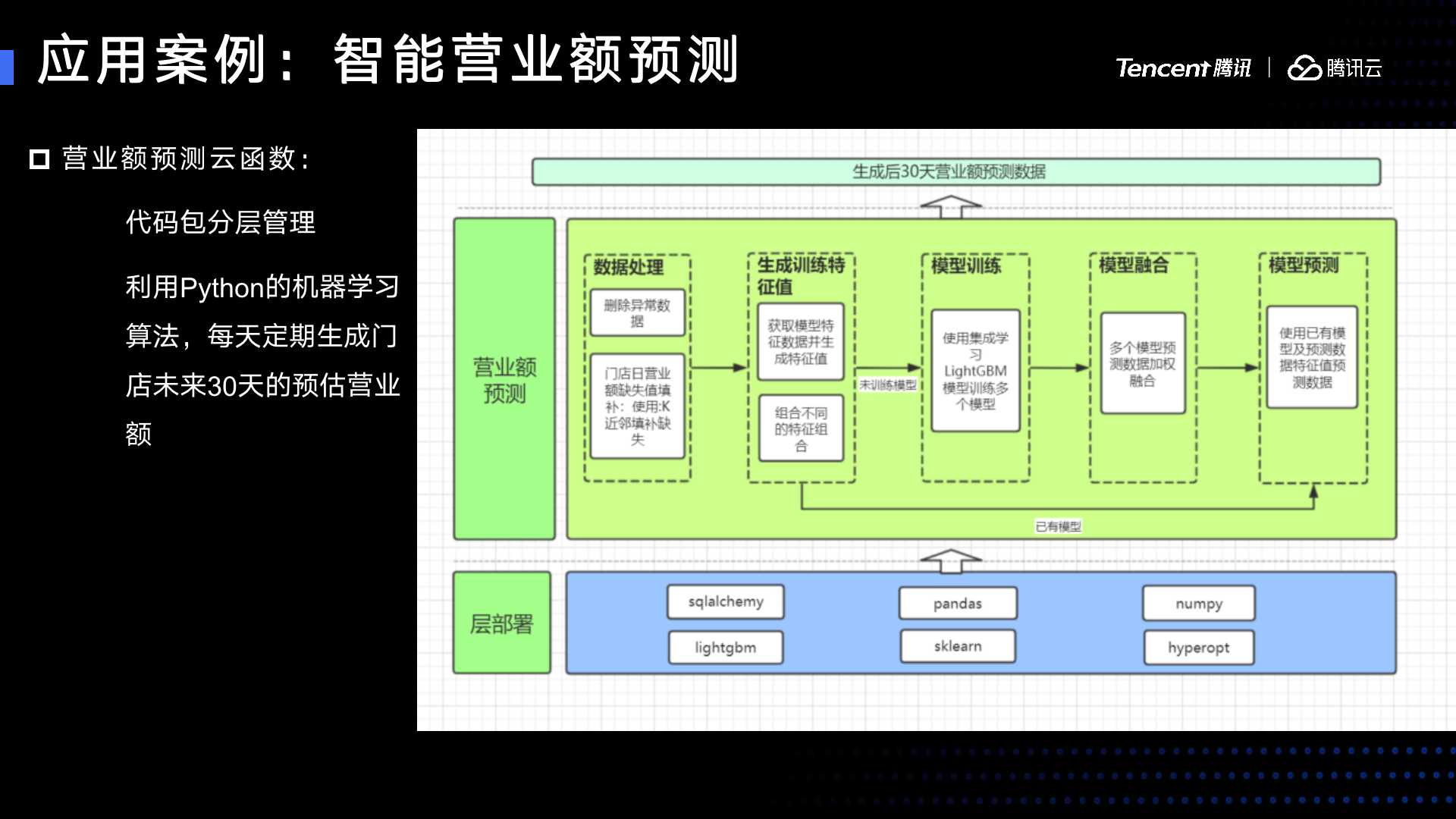 以营业额预测为例,具体我们是怎么做的?拉取近两年门店的营业额,最长拉两年,没有两年也可以拉,最少是一到两个月。通过这个数据,我们生成每一家门店接下来 30 天的营业额,这是每天滚动生成的机器学习的过程。