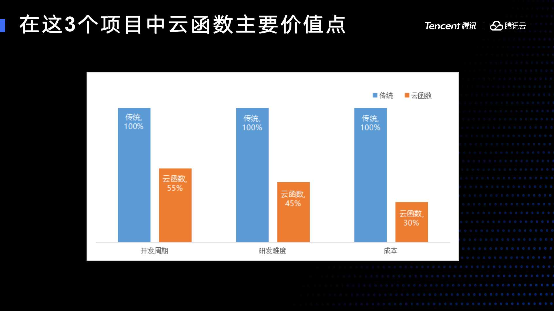 开发周期上面传统是百分之百,云函数是55%。研发难度传统是百分之百,云函数是45%。