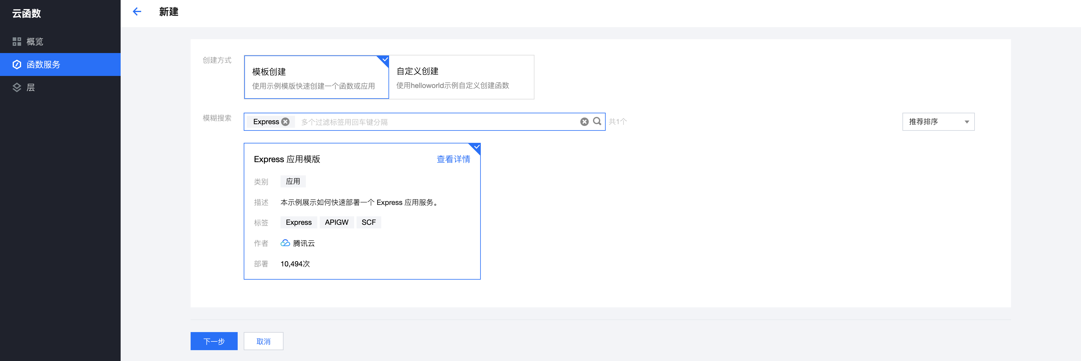 模版创建和 Serverless Framework 打通,在云函数控制台选择应用模版,单击【下一步】即可进入应用配置和创建流程。目前已经支持的应用有:Express,Laravel,Nextjs SSR,Nuxtjs SSR,SpringBoot,Koa,Flask和Egg,应用创建完成后可在 Serverless Framework 控制台查看和管理。
