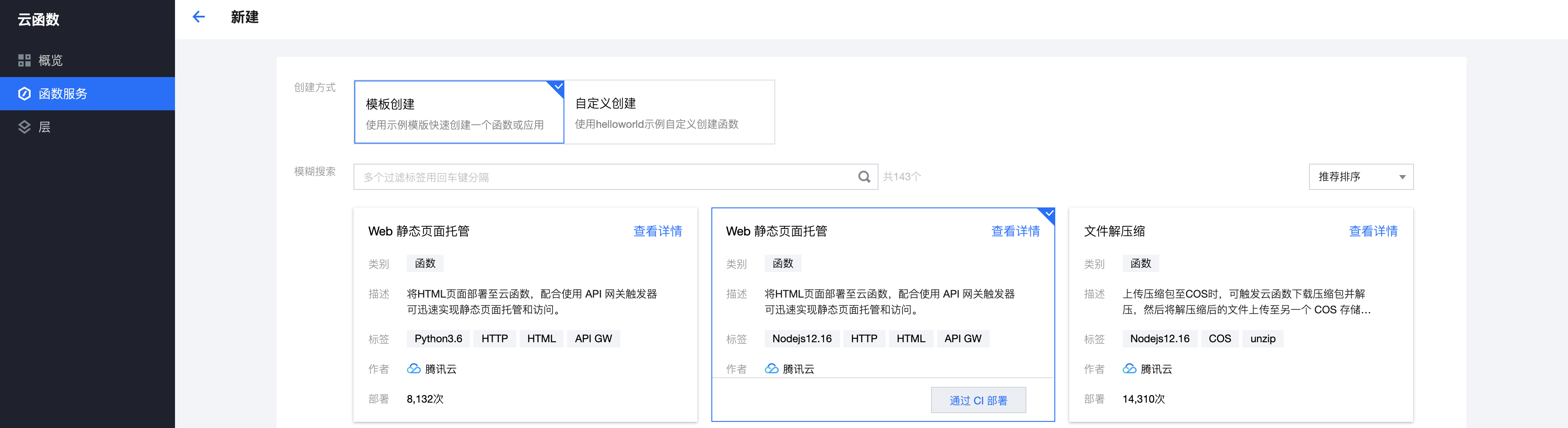 模版创建和 CODING 打通,在云函数控制台选择模版后单击【通过 CI 部署】即可在 CODING 侧完成通过 CI 创建一个函数或应用。
