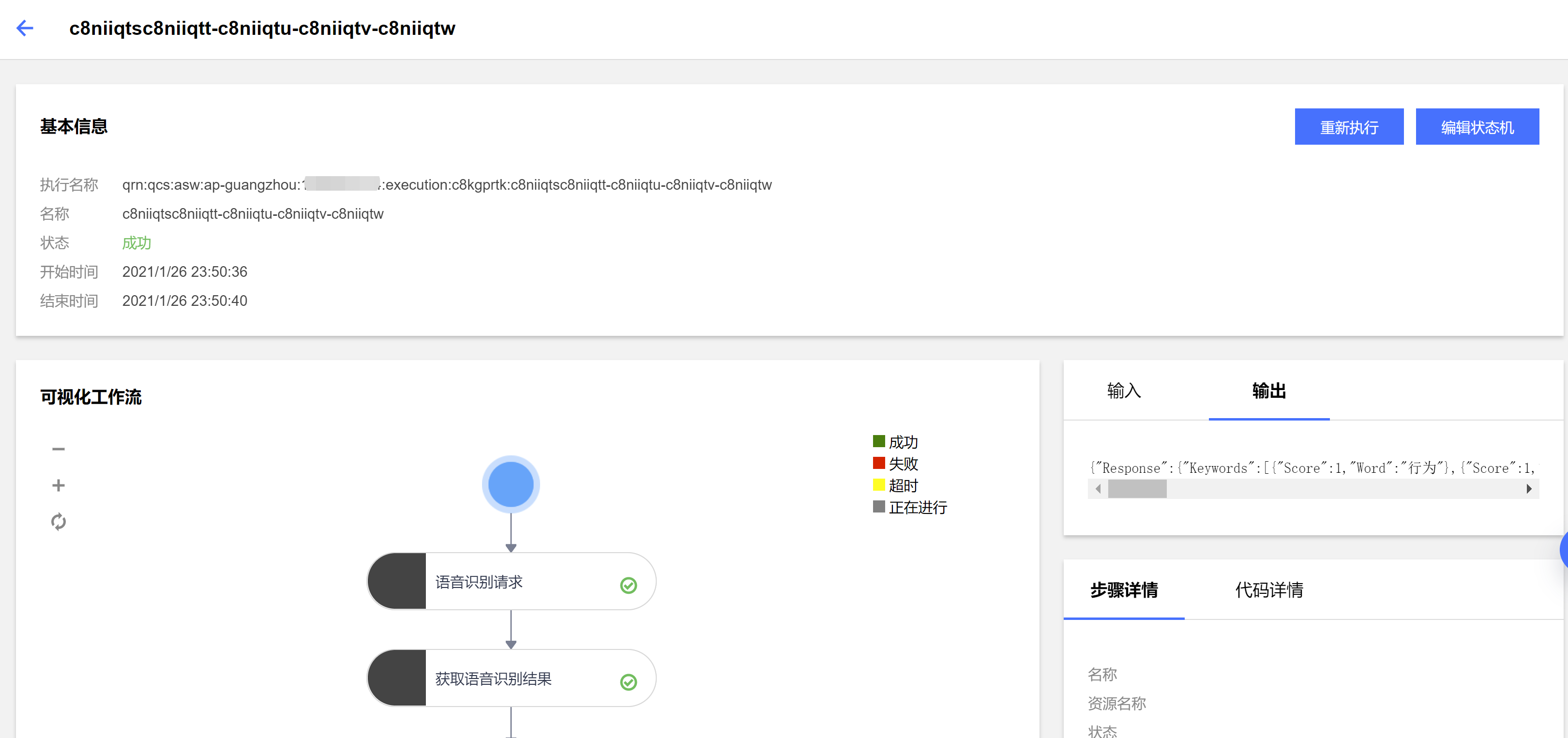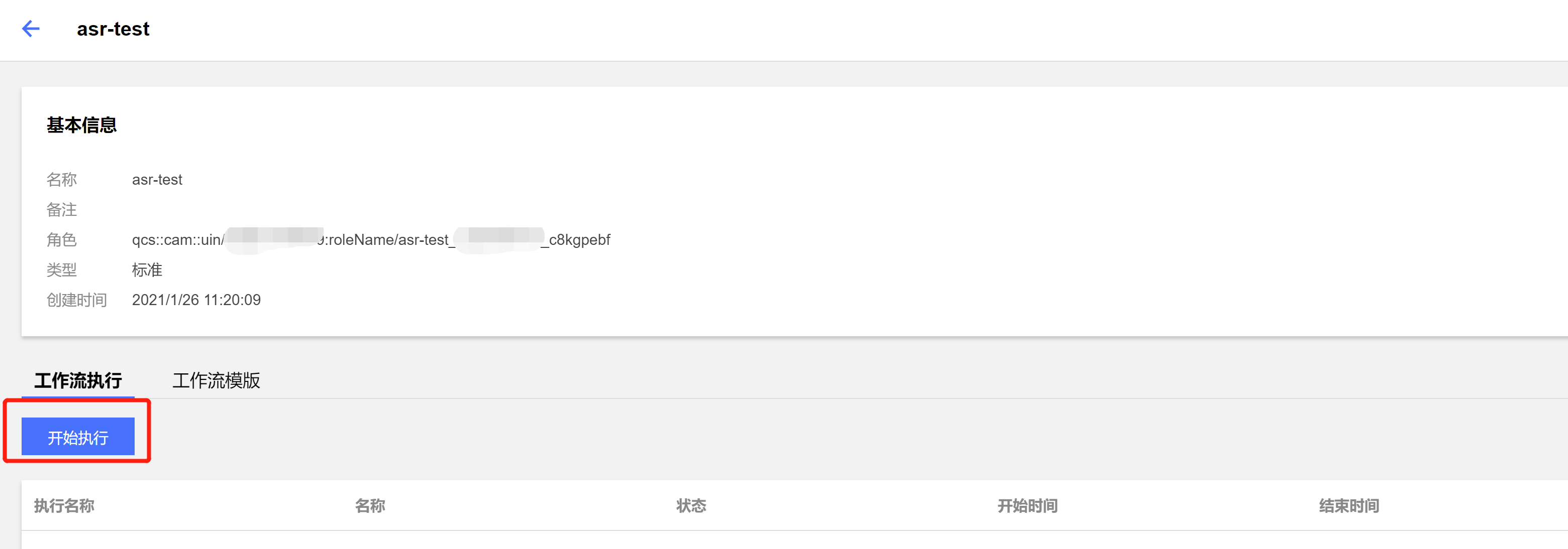 您可以在界面中看到状态机的基本信息。单击【工作流执行】下的【开始执行】