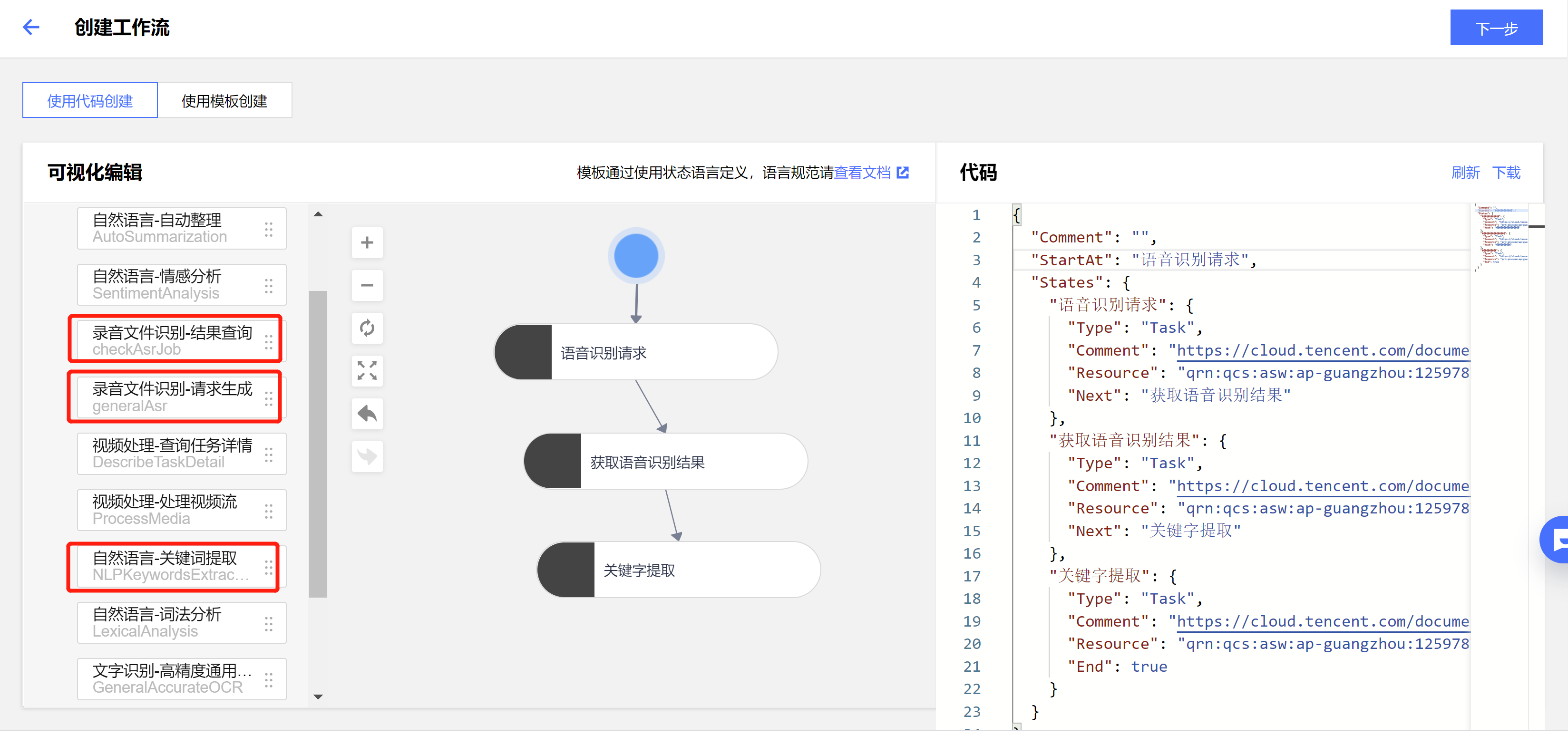 }说明:Task 中定义的 Resource 对应为云服务 API 接口的调用封装,Parameters 为调用时的传参。更多详情参考 状态机语言。