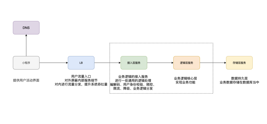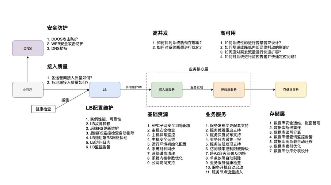 以上架构分为 LB、业务接入层、业务逻辑层、数据存储层等多个层次。
