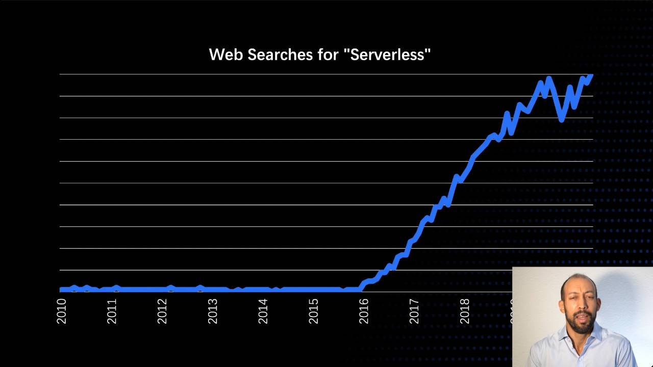 Serverless 广受关注,这张图表展示了人们对它的兴趣有多大,增长的速度有多快 —— 这是人们在 Google 上搜索 Serverless次数的变化趋势。你可以看到,自从AWS lambda在2015年面世以来,出现了飞快的增长。当你看到这些图表时,可能你会说,这里一定发生了一些非常有趣的事情,让我更多地了解一下为什么会这样。