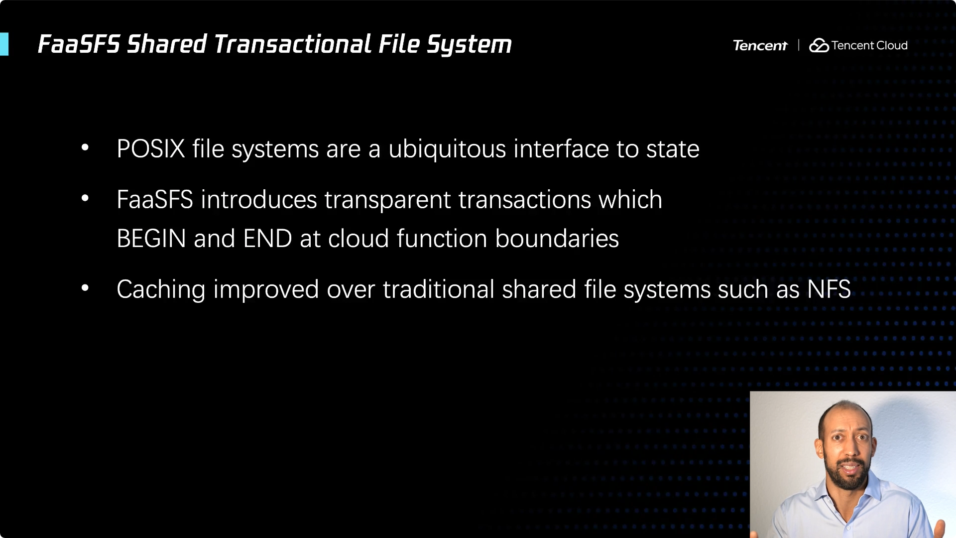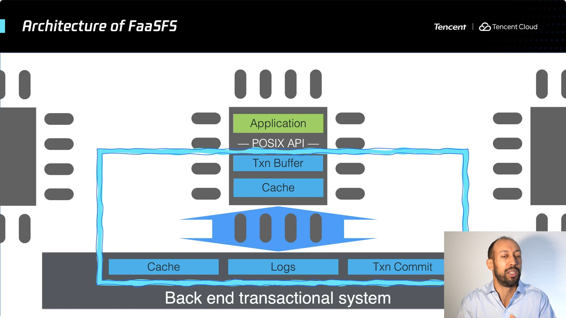 为了解决这个问题,我们构建了一个共享文件系统,称之为 FaaSFS 。提供了集成事务机制的缓存,能够确保数据非常靠近算力,可以非常快地访问,并且保持了数据的全局一致性。