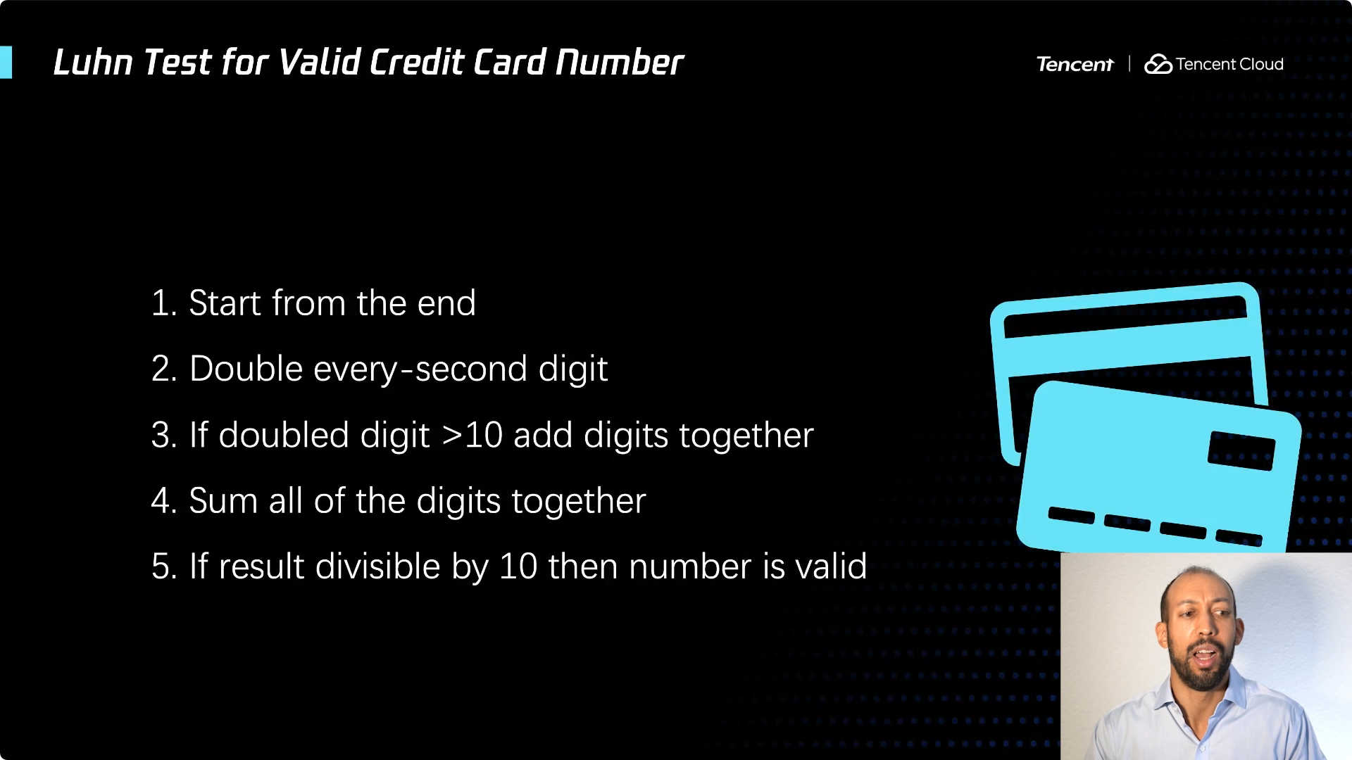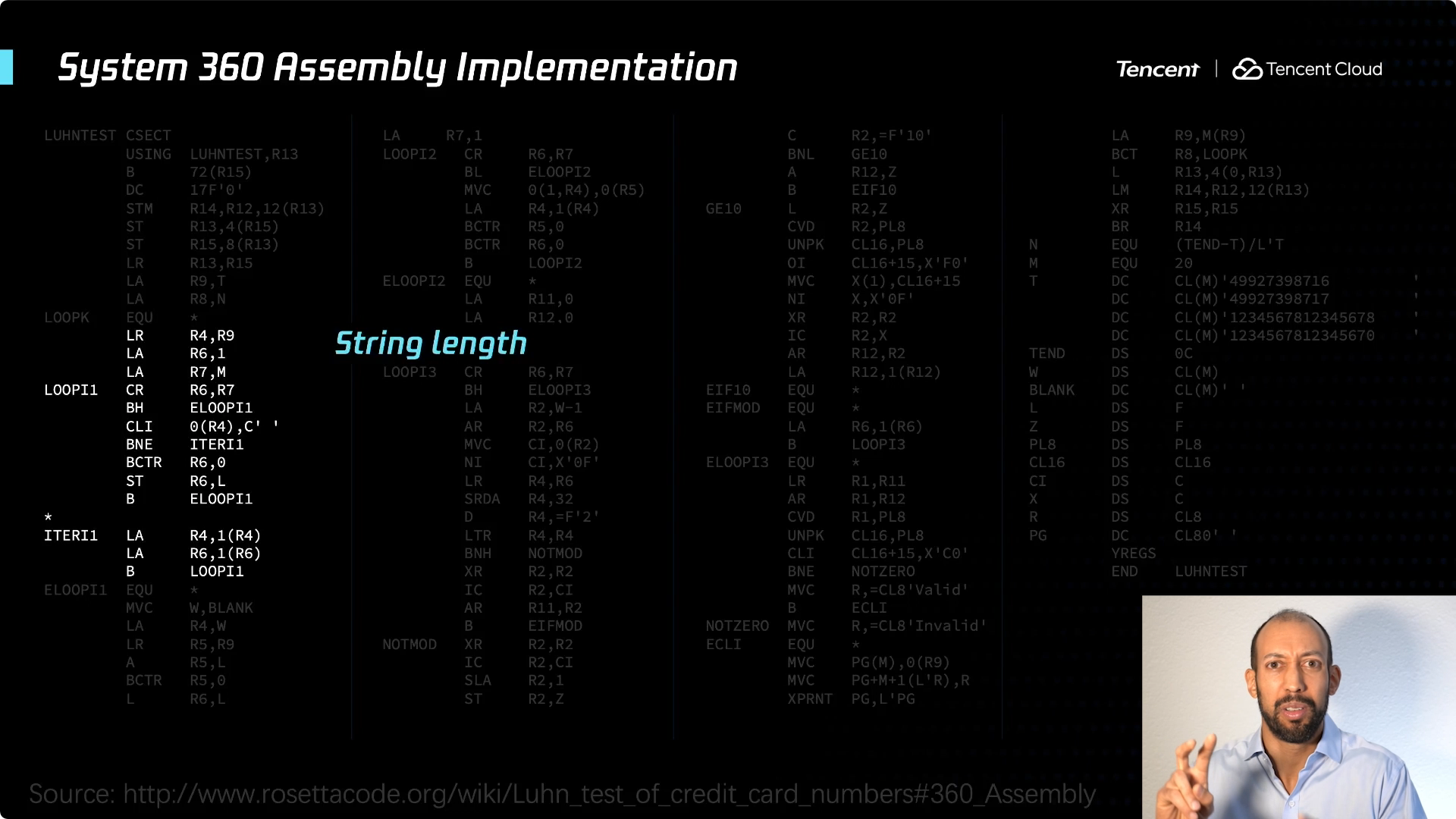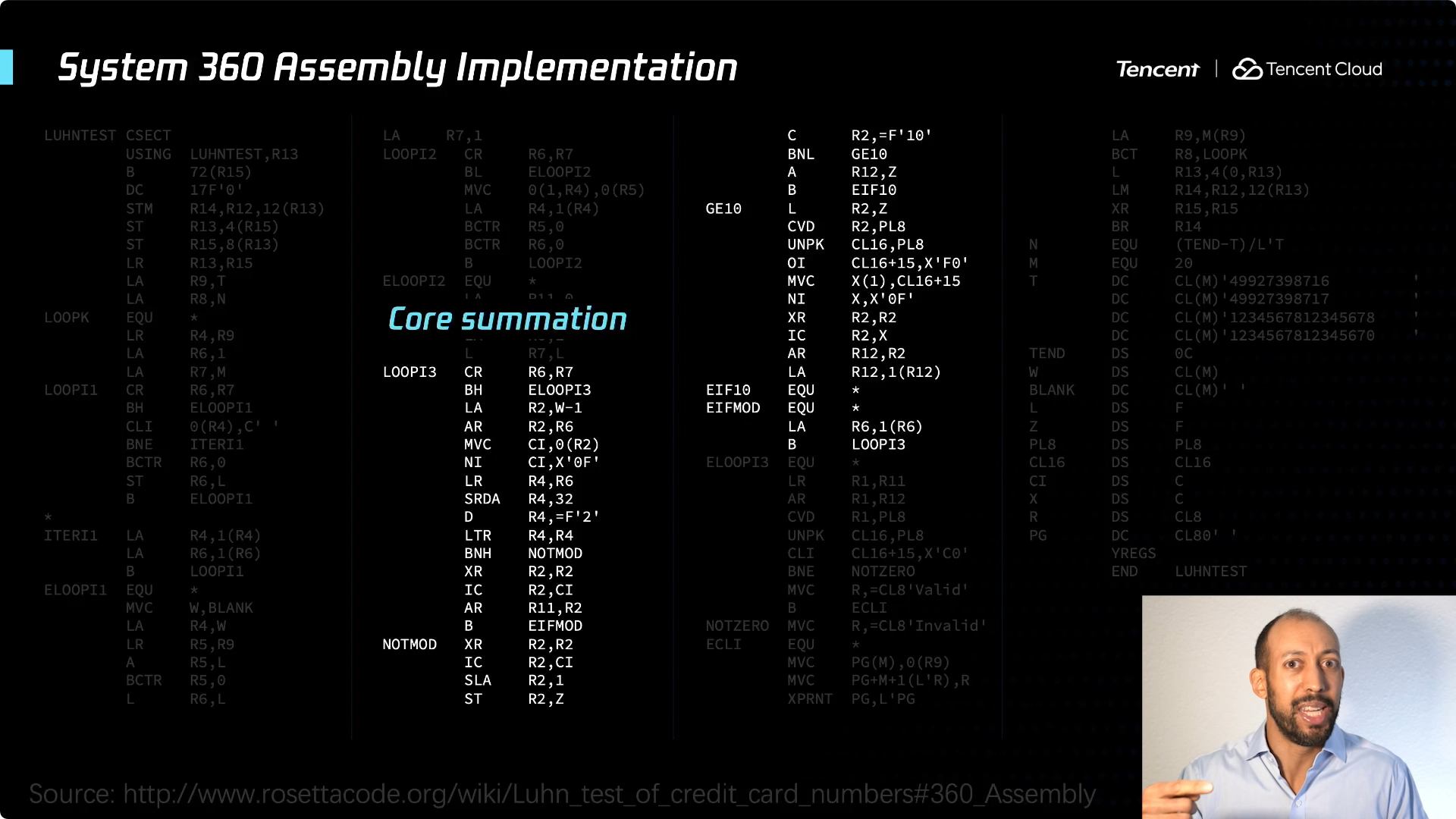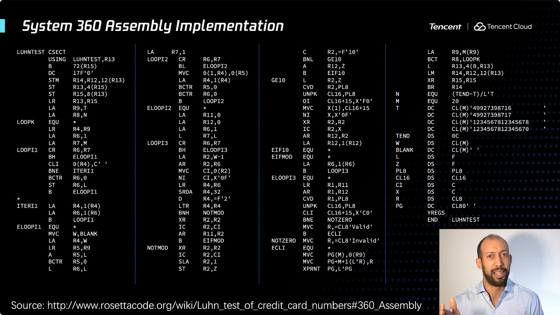 在此我想展开讲一下,给你们一个具体的例子,以便对 System 360 有更清晰的认识。这是校验信用卡号码的 Luhn 算法,一个简单但古老的算法。如果想要查看该信用卡号码是否有效,可以采用一个简单的方法 —— 实际就是一种校验和。从卡号的末尾开始偶数位都乘以2,如果结果是大于10的数字,则将个位和十位相加即得到一位数字,把所有数字相加得到总和。如果可以被10整除,就是一张有效的信用卡。超级简单的算法,对吧?