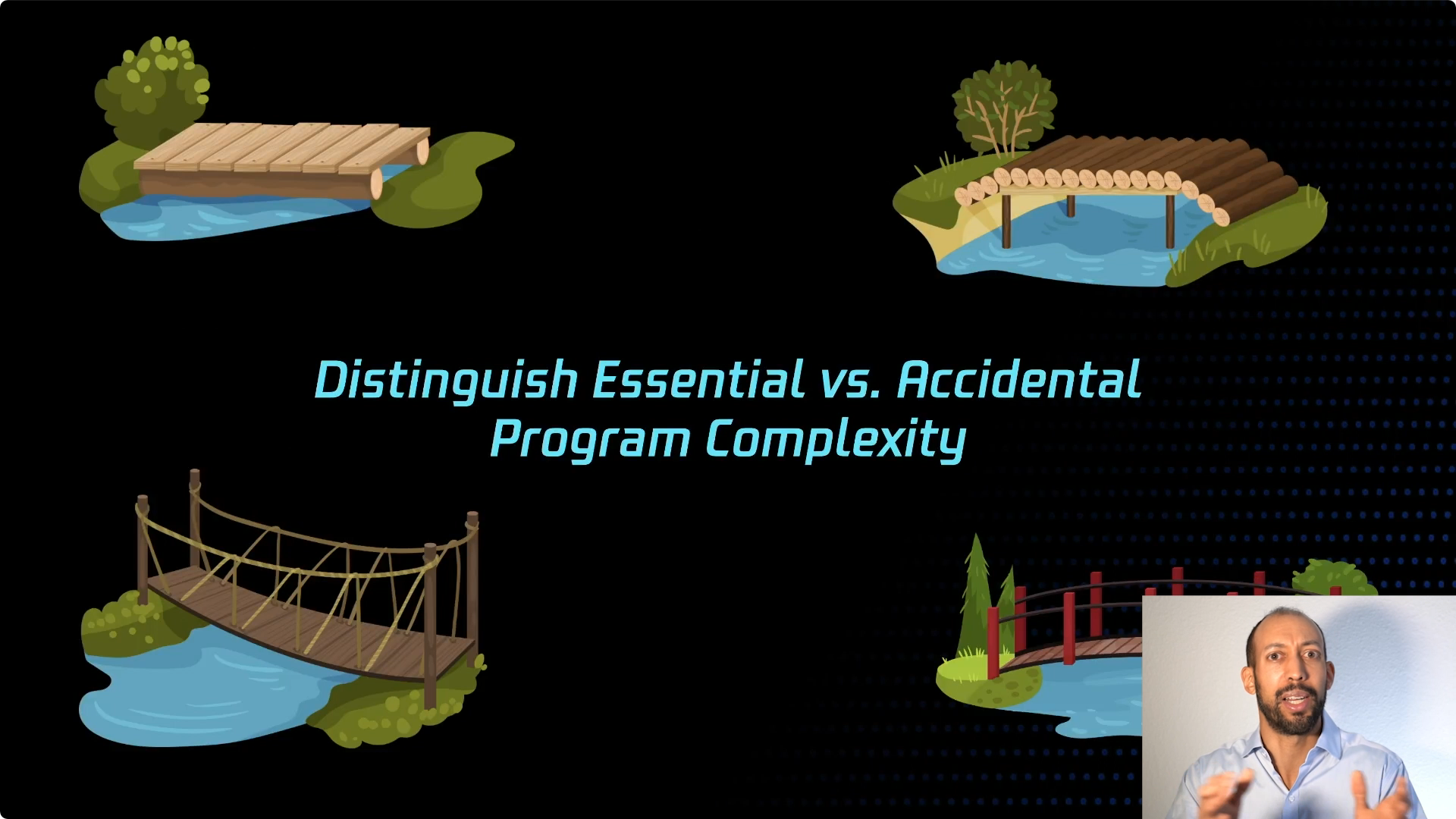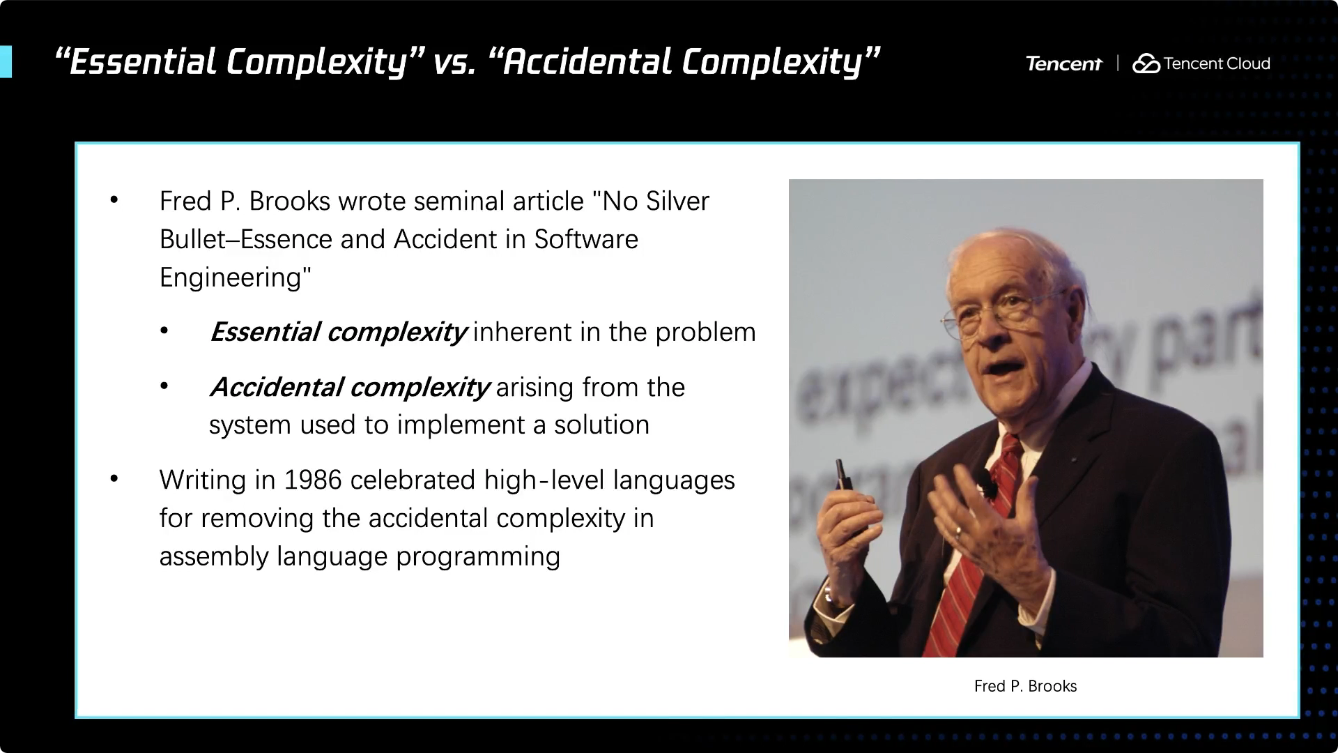 Fred Brooks 是 System 360 的主要领导者之一,他领导了操作系统和许多硬件团队,后来他成为一位非常杰出的教授和图灵奖获得者。1980年代后期,他撰写了开创性的文章,在其中他区分了计算机程序的复杂度,并且提出了与你的应用业务有关的是本质复杂度。也许业务本质复杂度是很有限的,但是计算机带来了复杂度,这就是业务功能的技术实现细节。就像那座桥,取决于我们用的是绳子、钢材还是木头,我们会有很多不同的技术实现细节。这些技术细节实际上非常重要,正是因为这些技术让事情变得可行,但它们与你应用程序的业务逻辑并没有关系,与解决方案的最终结果也无关。