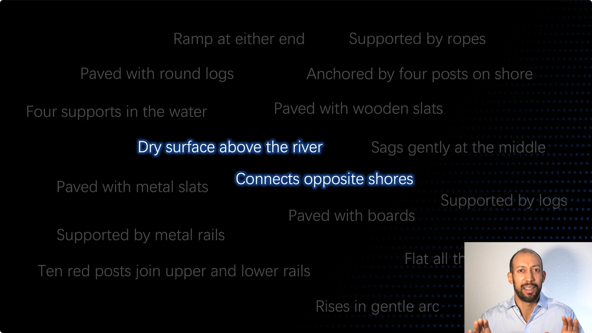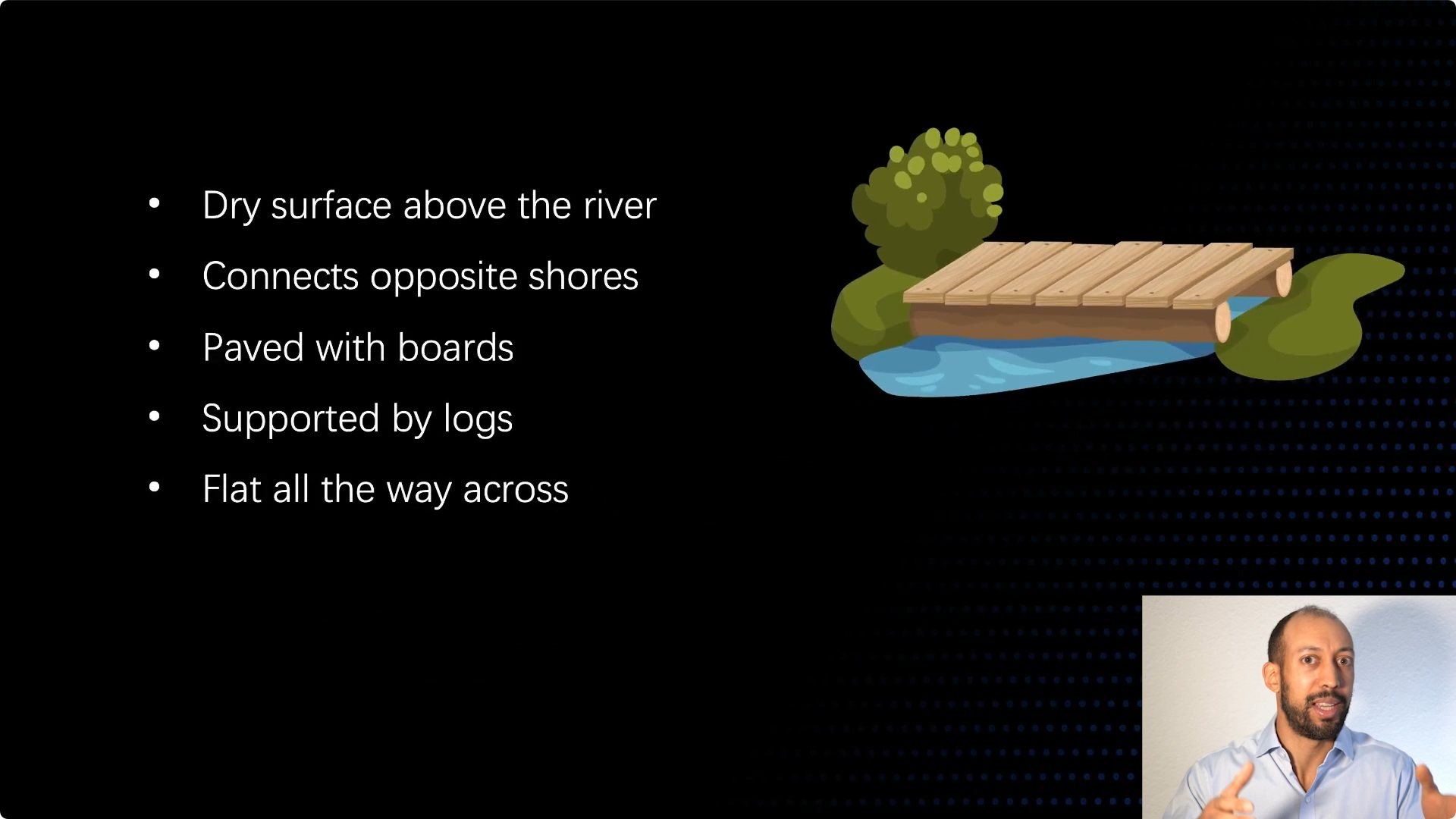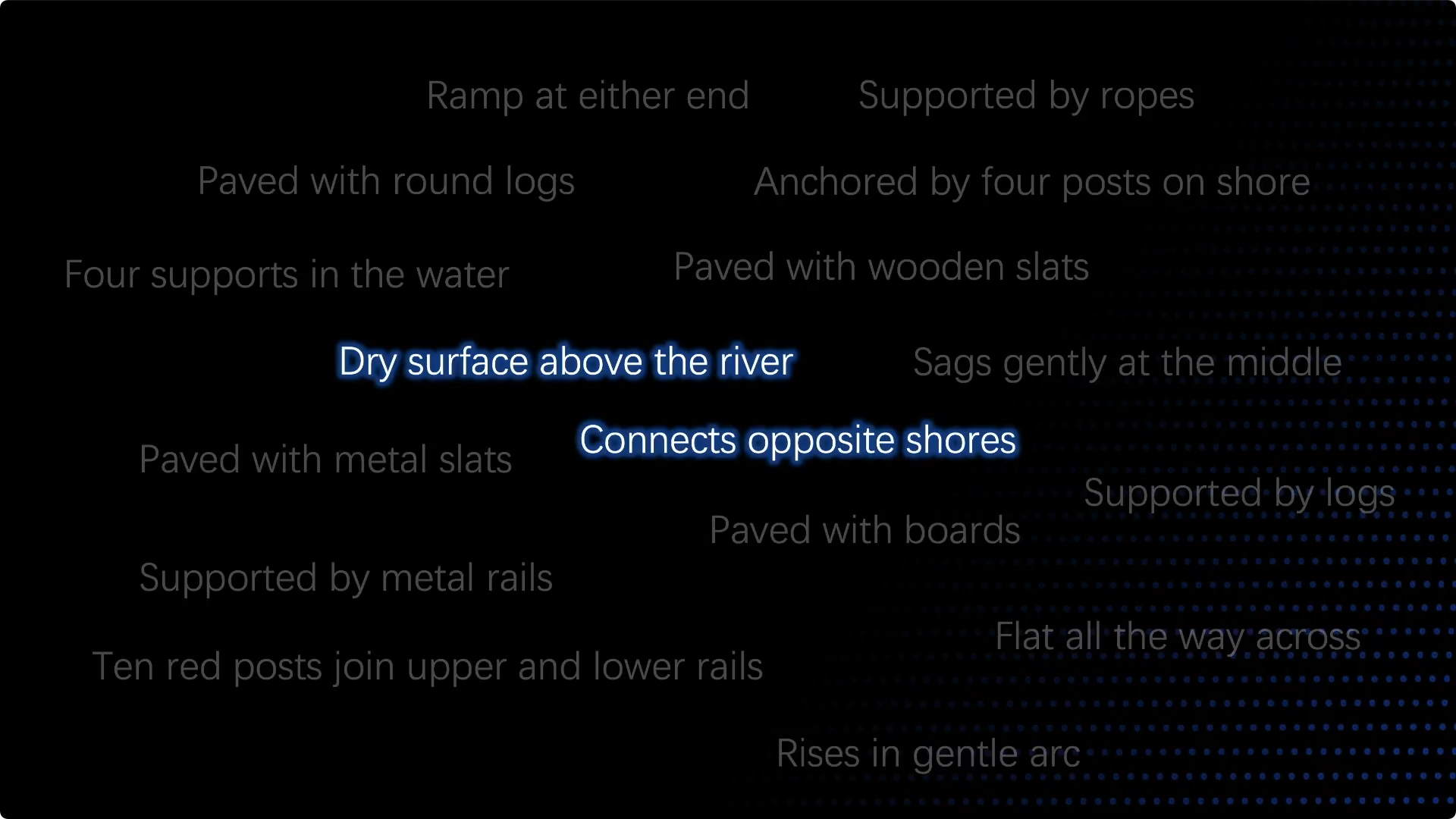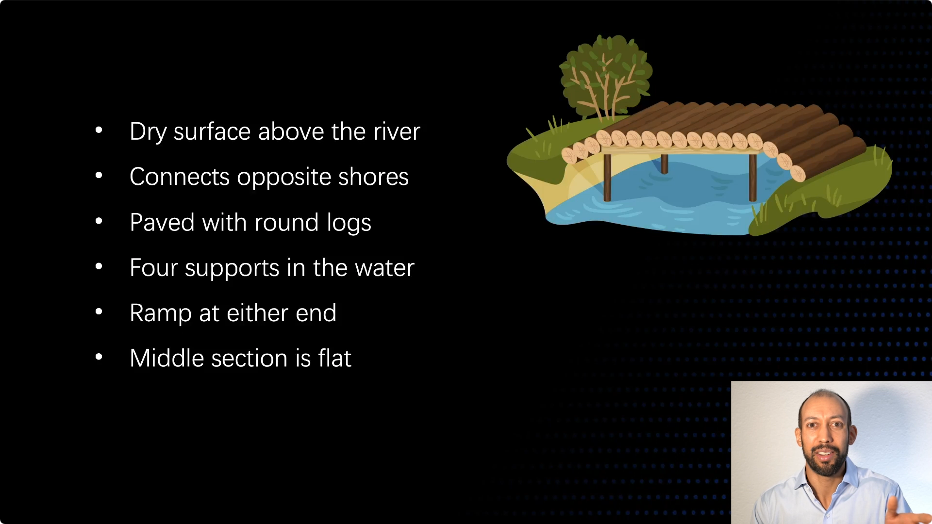 请看这是什么,这是一座桥梁。它是一座横跨溪流的桥梁,它有相当多的属性。这是架在水上的干燥路面,它连接着两岸上面铺装了原木,它有四根支撑,两端都有斜坡,中间的部分很平整。这些是用来创造桥梁的技术,你明白它的作用是什么,连接河岸两端的能力也有很多属性。