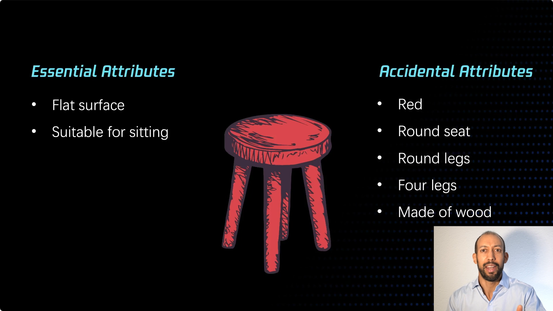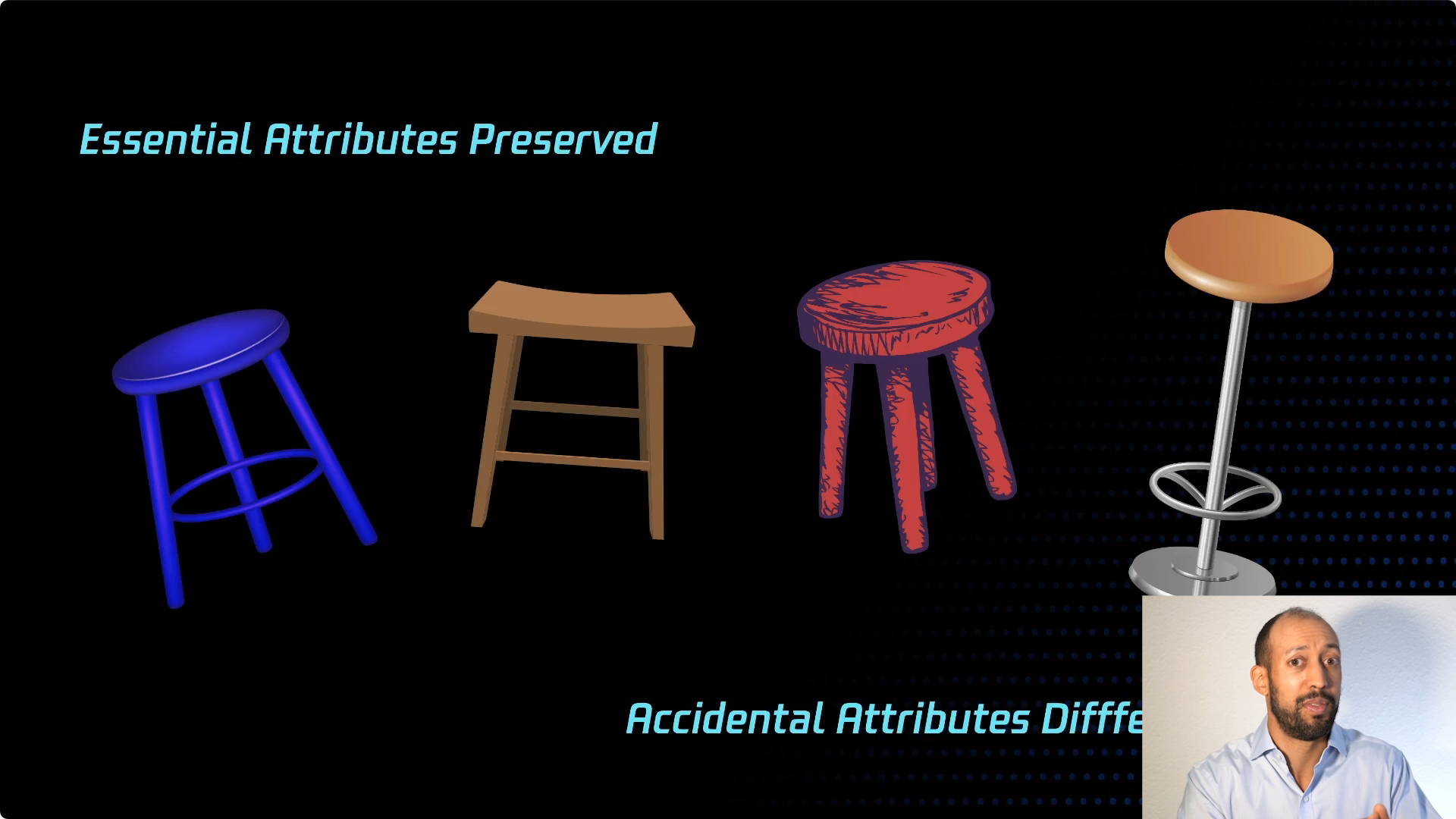 一把凳子可能有不同的属性。我们可以看到我这里有很多例子,很多不同类型的凳子,有些有三条腿,有些只有一条腿。但它们都是凳子,它们有相同的用途和功能,但它们的工作机制各不相同。所以你可以看到每个凳子,本质属性都被保留了下来,而那些偶然属性则有所不同。