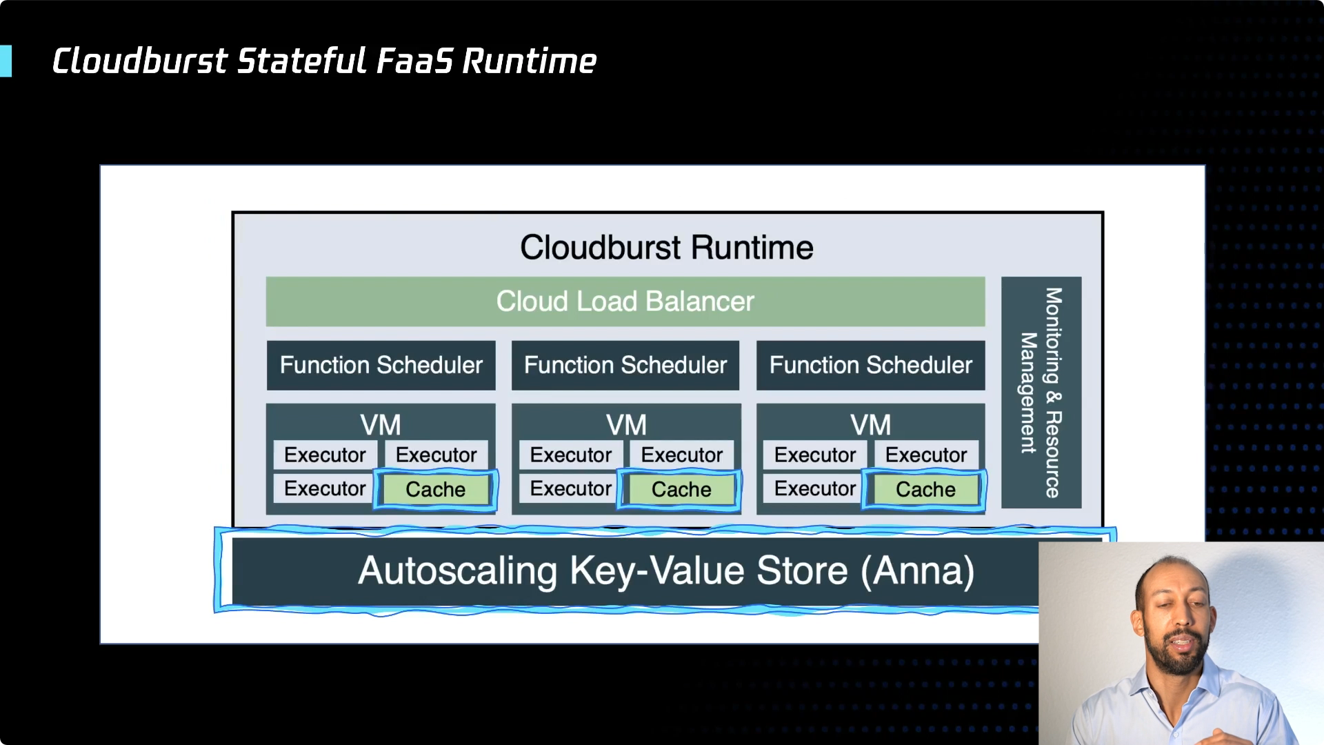 第一个是无状态计算的限制。在伯克利我们开发了一个名为cloudburst的系统,它将高性能K-V存储与FaaS运行时集成在一起,允许数据缓存与主机放在一起,在 Serverless的环境中实现了高性能计算。