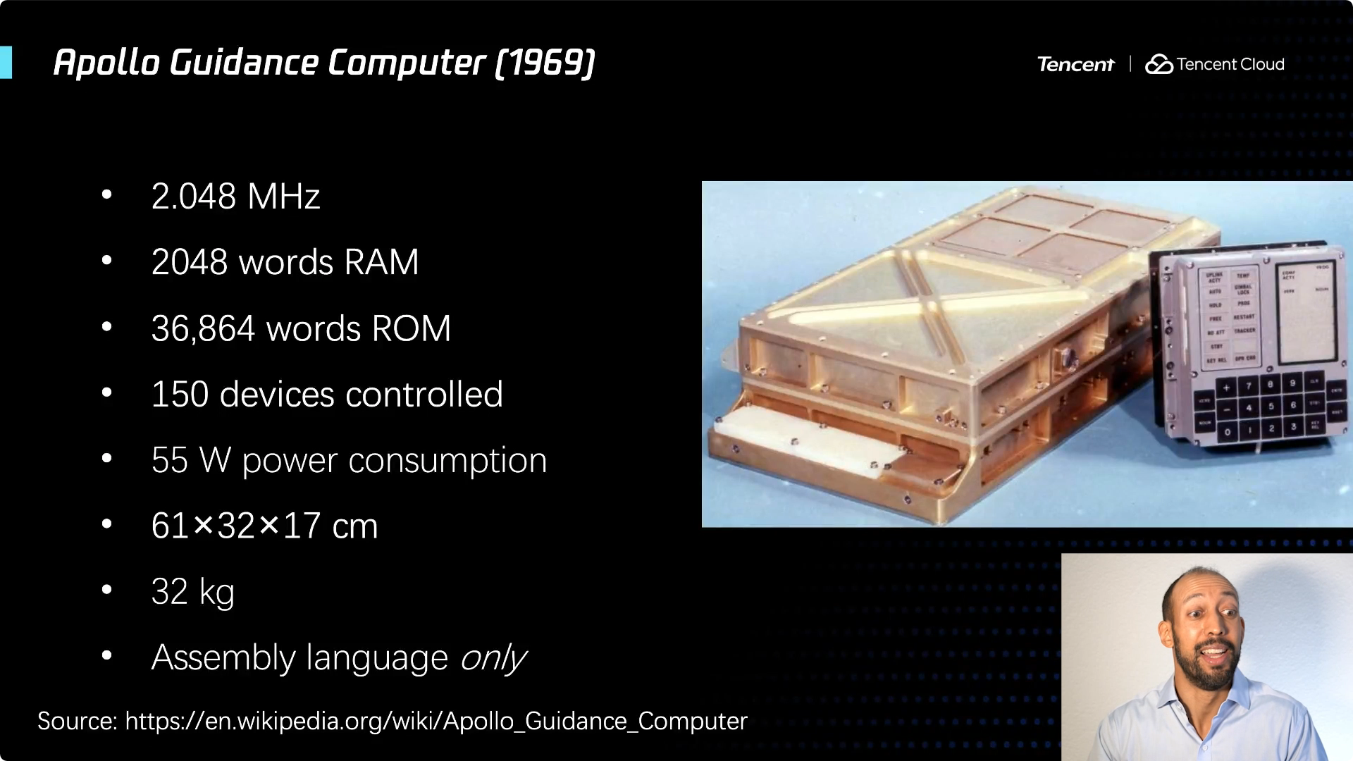 这是一张阿波罗制导计算机的照片,它的运行频率是 2MHz,可能比你今天拥有的最慢的计算机或手机慢一千倍。不仅如此,这里还有一件非常有意思的事——资源是如此的有限!真的,这导致用汇编语言编程的人们需要详细地思考,如何去使用这 2,048 个字节的内存,这就是你能使用的全部内存,需要以非常谨慎地使用内存的每一个字节。记住,我们要去月球的时候,火箭上有一百五十种不同的装置需要去控制,而我们只需要使用这么一点点内存就可以做到。