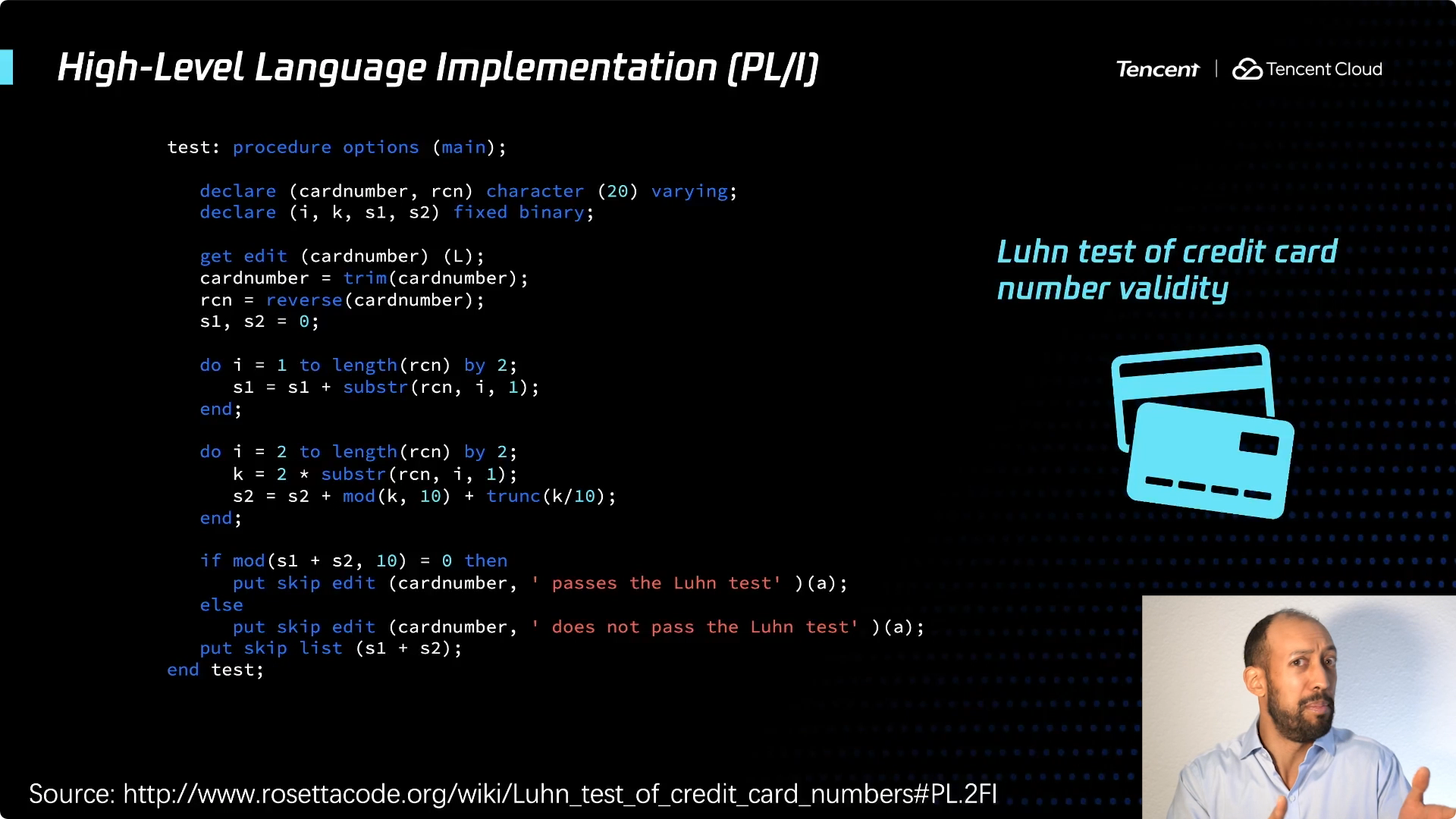 事实上,如果我们使用像PL/1这样的编程语言。这代码看起来可能你们大多数人都不认识,当你看到它,可能你会说这可能是2020年最新最伟大的新语言,就这么简单。右读一些输入,得到该数字,颠倒它,然后对奇数位和求和,然后对一些偶数和求和,并根据需要执行判断逻辑,看看它是否被10整除,如果是则通过测试,否则就不通过。这个很十分简单。